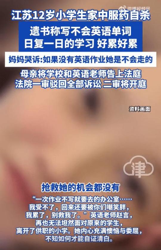 1月11日(发布),12岁小学生家中服药自杀,遗书称写不会英语单词,妈妈哭诉:女儿吞下姥姥的心脏病药,药效很快连抢救的机会都没有。