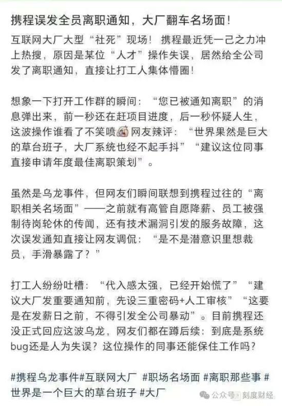 另据新浪财经消息,此次事件并非真实裁员或离职安排,而是内部系统操作失误。事件发生后,携程通过内部OA、企业微信等渠道向员工澄清情况,说明此次为系统测试阶段的乌龙事件,不存在全员离职计划,并向受影响员工致歉。
