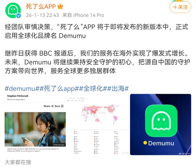 1月13日晚,“死了么APP”官微宣布,经团队审慎决策,“死了么”APP将于即将发布的新版本中,启用全球化品牌名Demumu。