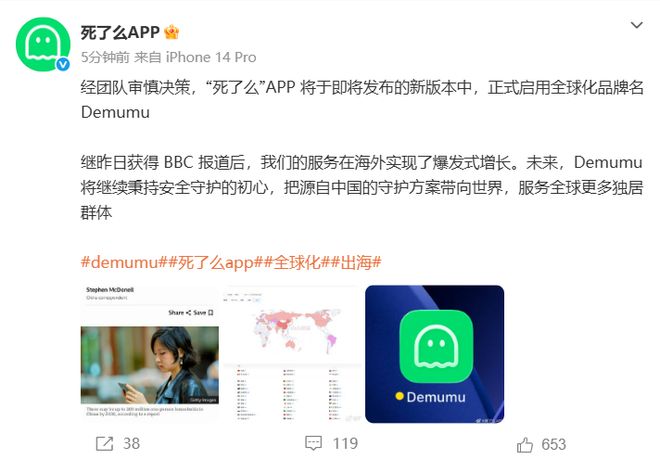 1月13日,“死了么”团队发文宣布,经团队审慎决策,“死了么”APP将于即将发布的新版本中,正式启用全球化品牌名Demumu。并称目前服务在海外实现爆发式增长,目标服务全球更多独居群体。
