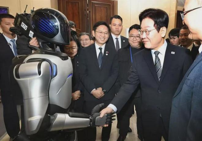 1月7日,中韩创新创业论坛在上海举行,韩国总统李在明与论坛企业展展区上的中国机器人握手 图/新华社发