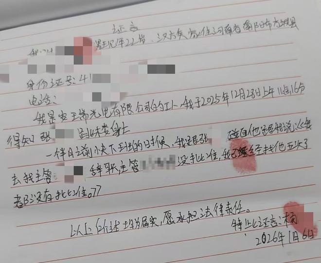 张先生表示,2025年12月27日下班后晚上12点左右,小张在公司附近一小区34楼跳楼身亡。事后警方排除他杀,家属认为小张死亡是公司不准辞职导致,希望其担责赔偿,“来到芜湖10多天,去公司门口都是不让进去。”小张的多名工友做了小张辞职不批的证言。