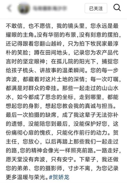 15日上午,另一名摄影师在追忆文章中称,在他的镜头里,没有华丽的布景,没有刻意的摆拍,贺娇龙永远是最耀眼的主角。他曾跟着贺娇龙翻山越岭,只为拍下牧民最淳朴的笑容,还曾在孤儿院的阳光下,捕捉到贺娇龙给孩子梳头、讲故事的温柔瞬间。她的每一次奔波,都藏着对这片土地的深情,每一次叮嘱,都满是对群众的牵挂,“那些一起走过的山山水水,如今都成了思念的坐标,走到哪里,都能想起您的身影。”