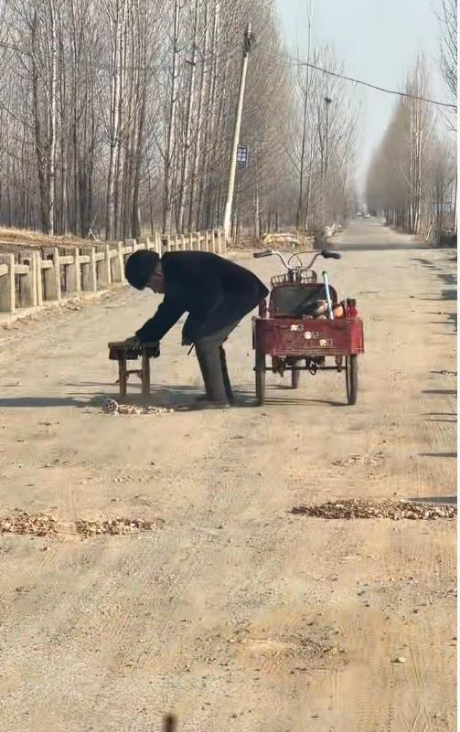 1月14日,一山东网友发布的视频显示,一位老人站在三轮车旁,将车斗内的煤球渣扔在路上,缓慢拿起折叠凳弯腰将煤球渣压碎,将桥面坑洼处垫平,然后再次捧起车斗内的煤球渣,寻找桥面坑洼,丢在坑洼处将煤球渣踩碎。视频中,多辆路过此处的车辆颠簸,行驶谨慎。