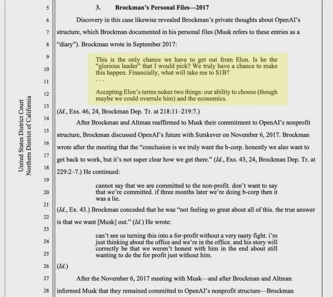 这些记录显示,Brockman 曾在日记中写道:「这是我们摆脱 Elon 的唯一机会…… 从财务角度,什么才能让我达到 10 亿美元?」并讨论转向营利结构,以避免马斯克的控制「破坏经济利益」。