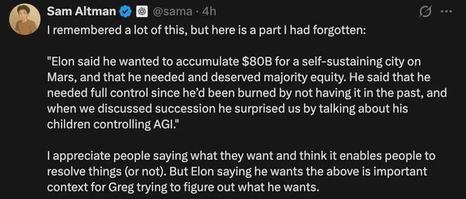 「我之前记得很多这些细节,但这个部分我完全忘了:『Elon 说,他需要攒到 800 亿美元来建一个能在火星上自给自足的城市,他认为自己需要、也配得上多数股权。他还说必须有完全的控制权,因为以前没控制权吃过大亏。在聊到公司继任、接班问题时,他突然提到要让他的孩子们来掌控 AGI,这让我们挺震惊的。』我觉得大家直接说清楚自己想要什么挺好的,这样才能真正解决问题或看清没法解决。但 Elon 当时提出这些要求,正是 Greg Brockman 纠结、思考公司未来方向的重要背景。」