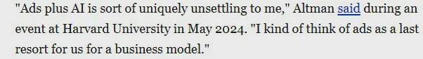 在奥特曼介绍 ChatGPT 广告的推文下,有网友还扒出了 2024 年 5 月奥特曼在哈佛大学演讲里的内容,当时他说:广告对我们来说是一种商业模式的最后选择。