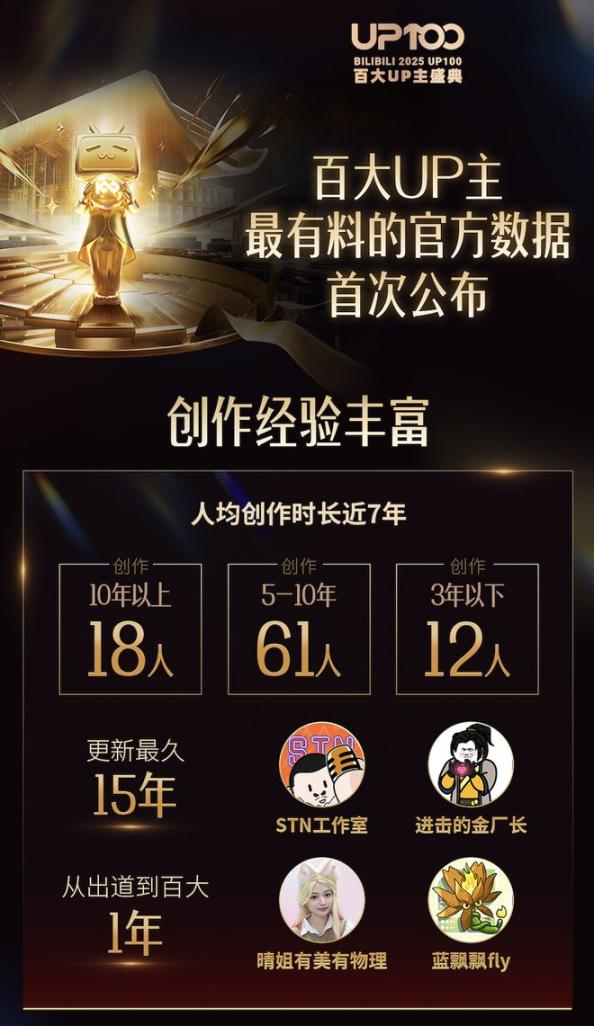 官方公布了一组很有意思的数据,这100位创作者平均的“练习时长”接近7年,其中18人创作时长超10年,@STN工作室和@进击的金厂长 更是持续创作了15年。