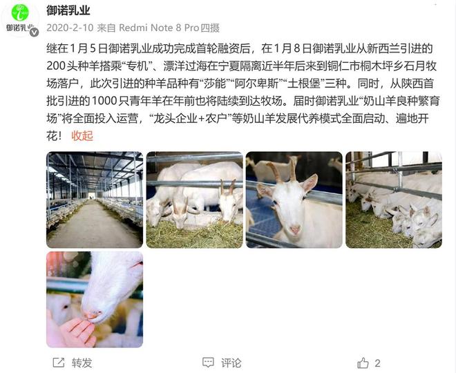 2019年4月,御诺乳业总经理张源在贵州本地媒体上介绍,公司铜仁项目总投资7.16亿元,将建3000亩青贮玉米基地、7000只奶山羊种羊示范场,以及2万吨婴配奶粉、10万吨液态奶生产线;达产后预计产值30亿元、利税超5亿元,建成国内最大羊乳综合加工基地。彼时,液态奶生产设备已完成试生产。作为公司董事长曹曦在这篇报道中宣称,御诺乳业羊乳加工在国内处于领先地,在国内羊奶市场的份额可占20%。