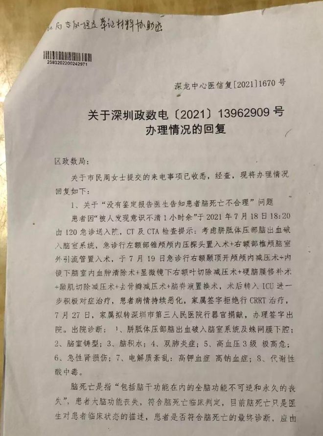 医院就诊记录显示,入院时,其双侧瞳孔缩小,对光反射迟钝,诊断为脑出血、极高危高血压等。紧急手术后,其瞳孔持续散大,对光反射消失。临床上,这通常是判定脑死亡的佐证之一。