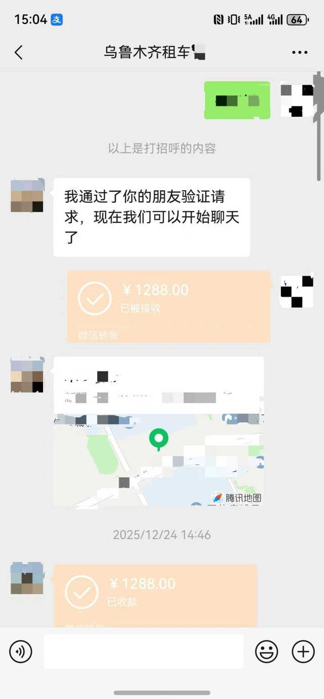 许先生回忆称,当天验车后,车行工作人员询问了许先生的旅程路线。在得知其行程包含阿勒泰地区的禾木和喀纳斯后,对方提出,这些景区属于“超区域行驶”,需要加收200元/天的费用。经过协商,许先生接受了车行的加价要求,并通过微信向车行转账1288元。