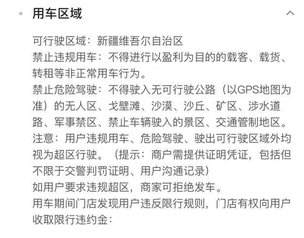 许先生说,答应补钱是出于行程安排的无奈,根据哈啰租车平台规则,用户租车不得驶入“无可行驶公路的无人区、戈壁滩、沙漠、沙丘、矿区、涉水道、军事禁区、禁止车辆驶入的景区、交通管制地区”。而喀纳斯景区冬季允许社会车辆在安装雪地胎等条件下自驾进入,“我的路线都是根据导航行驶,旅途中并未去过平台所禁行区域,不理解为何认定他属于‘超区域行驶’。”