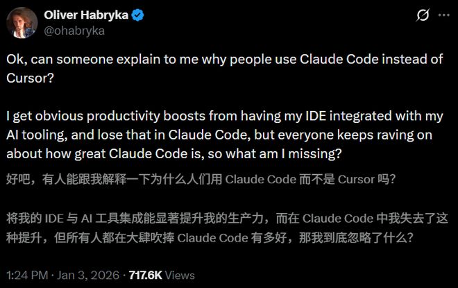 Twitter上曾有疑论者问:「有人能解释一下为什么用Claude Code而不是Cursor吗?」