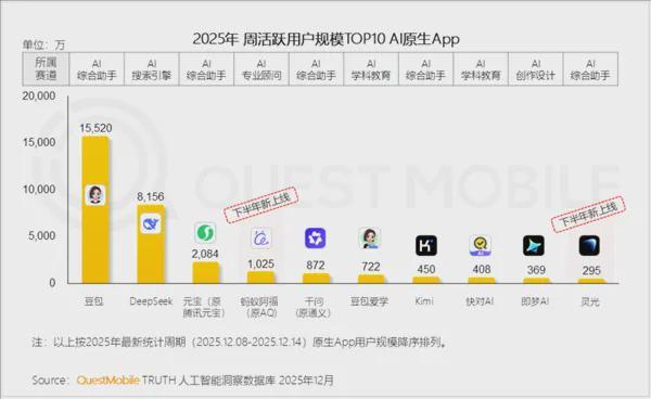 去年12月底,研究机构Quest Mobile发布的《2025下半年AI应用交互革新与生态落地报告》显示,全市场AI原生App中,最新周活跃用户排名前四的是豆包、DeepSeek、元宝、蚂蚁阿福,阿里千问位列第五。
