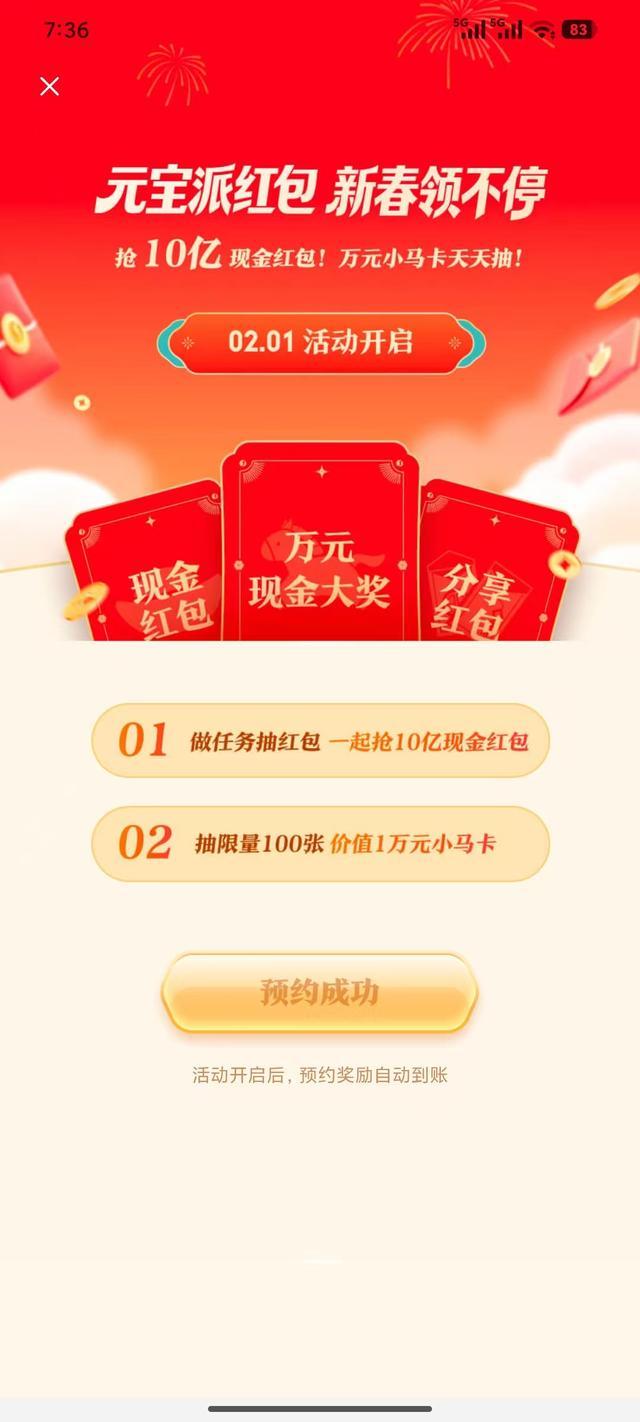 据介绍,1月25日起,用户将元宝App更新至2.55.0及以上版本,即可通过主页预约卡片进入春节会场预约页面。提前预约的用户可在2月1日活动开启时,额外获得10次抽奖机会。