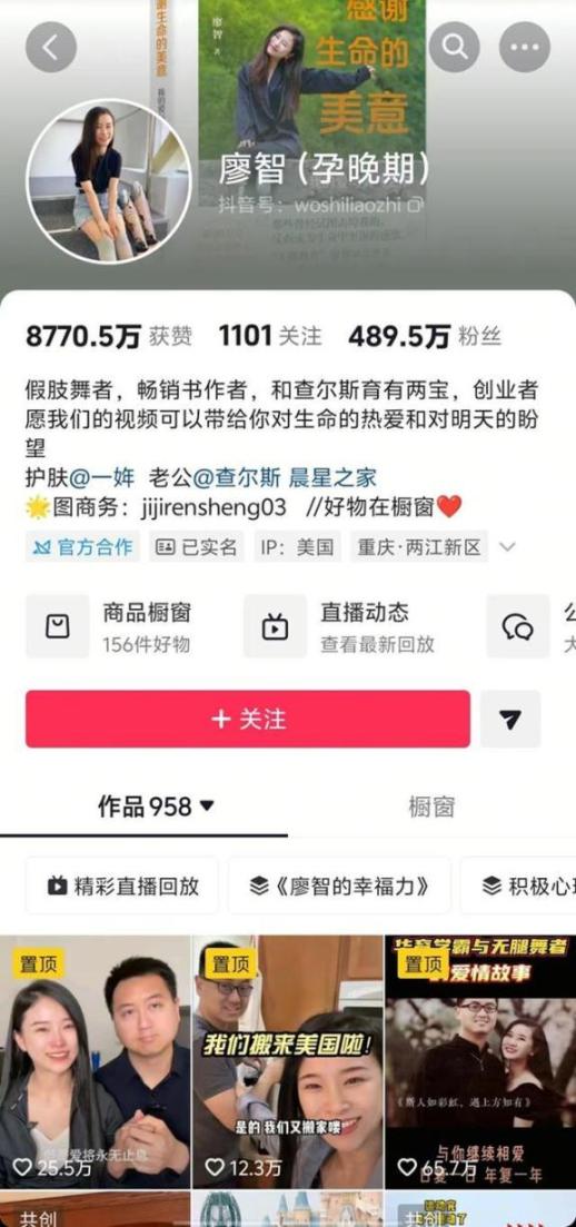 近日,假肢舞者廖智发视频称,其第四胎女儿出生,也是她截肢后的第三胎宝宝。
