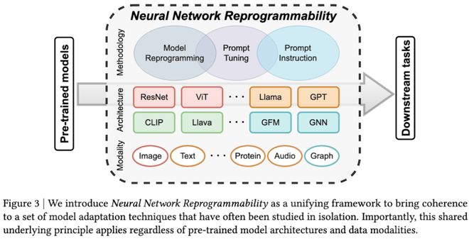 核心问题在于:prompt tuning,model reprogramming,甚至 in-context learning 真的代表不同的模型适配方法吗?答案是否定的。尽管表现形式各异,这些方法实质上都利用了神经网络的同一固有属性 -- neural network reprogrammability (神经网络可重编程性,图 3)。基于这一认识,我们提出统一框架来连接三个独立发展的研究领域,并系统性地描述和归类这些适配方法。