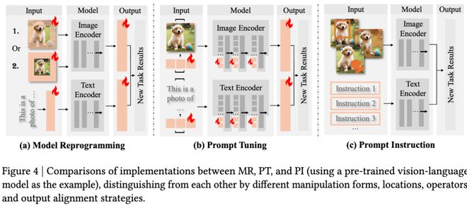 以视觉 - 语言模型(Vision-Language Model)为例,说明三种可重编程方法在实现上的差异(如图 4 所示)。