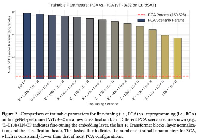 具体实验数据表明(图 2),相较 PCA,RCA 在参数效率上有明显优势。将 ImageNet 预训练的视觉 Transformer(ViT-B/32)适配到遥感图像分类任务(EuroSAT)。柱状图显示不同 fine-tune 策略的参数需求:从左到右分别对应 fully fine-tune 到逐步减少可训练层数的各种配置,训练参数量随之下降。但即便是最轻量的 PCA 方案仍需要大量参数。