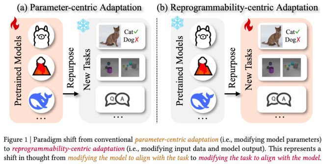 在本文中,我们认为随着预训练模型(pre-trained model)规模的增长,其适配下游任务(downstream tasks)的范式已经发生了根本性转变:从传统的基于模型参数调整的适配(图 1a)转变为了基于模型可重编程性的适配(图 1b)。