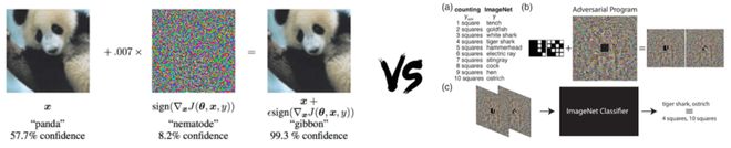 左侧(传统对抗样本 adversarial example):展示了经典对抗攻击,在熊猫图像上添加不可察觉的噪声,就能使 ImageNet 分类器将其错分为长臂猿,置信度高达 99.3%,尽管图像在人眼看来没有变化。