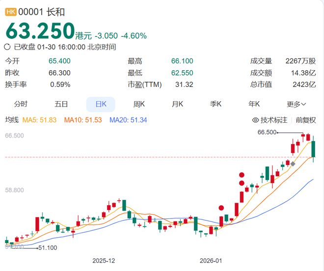 1月30日,今年来一路走高的长和股价跳水,一度跌超5%,截至收盘跌4.6%。