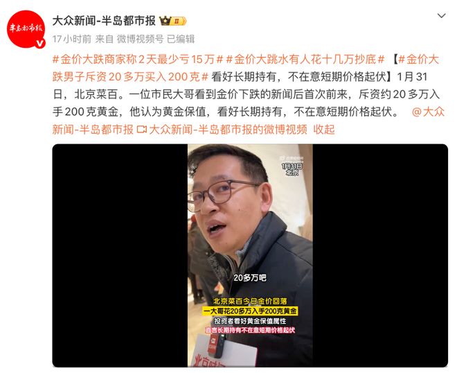 另据大众新闻-半岛都市报报道,1月31日,北京菜百。一位市民大哥看到金价下跌的新闻后首次前来,斥资约20多万元入手200克黄金,他认为黄金保值,看好长期持有,不在意短期价格起伏。