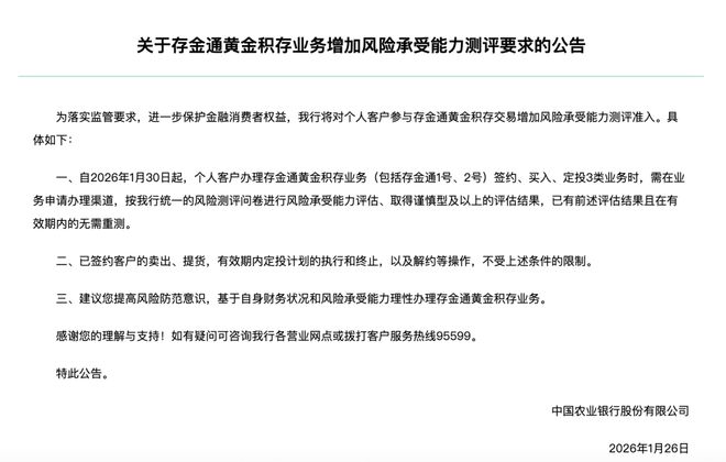 农业银行公告自1月30日起,增加对个人客户参与存金通黄金积存交易风险承受能力测评准入。个人客户办理签约、买入、定投三类业务,风险承受能力评估需达谨慎型及以上,有效测评结果无需重测;卖出、提货、定投计划执行与终止、解约等操作不受该条件约束。
