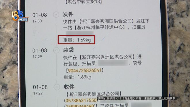 快递寄来时显示重量是1.2千克,衣服是塑料袋包装,寄回去时显示的是1.69千克。