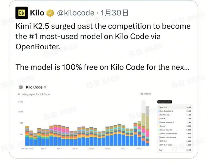 成为通过OpenRouter在Kilo上使用最频繁的模型。 更猛的是,Kilo随即宣布该模型在其平台上将完全免费。