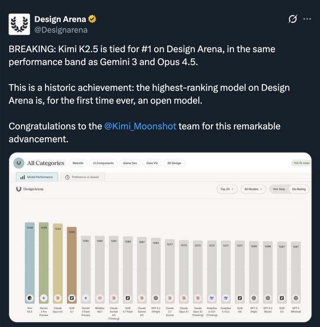 在专门评测代码能力的LM Arena榜单上,Kimi 2.5 位列总榜第七,依然是所有开源模型里最能打的那个。