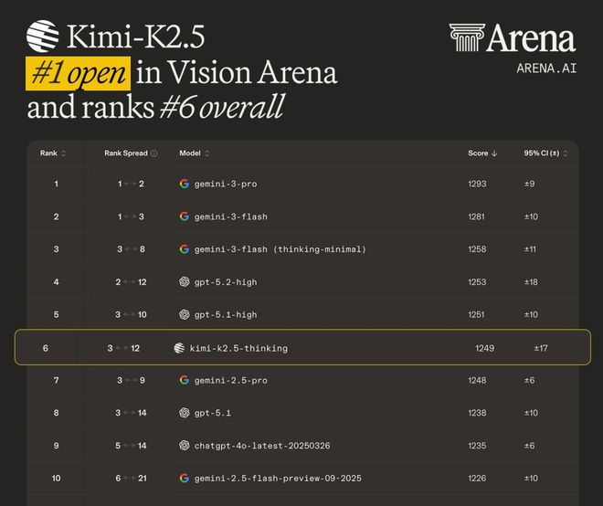 Kimi K2.5 与谷歌 Gemini 3 Pro、Anthropic 的 Claude Opus 4.5 并列为顶级模型,处于同一性能区间。