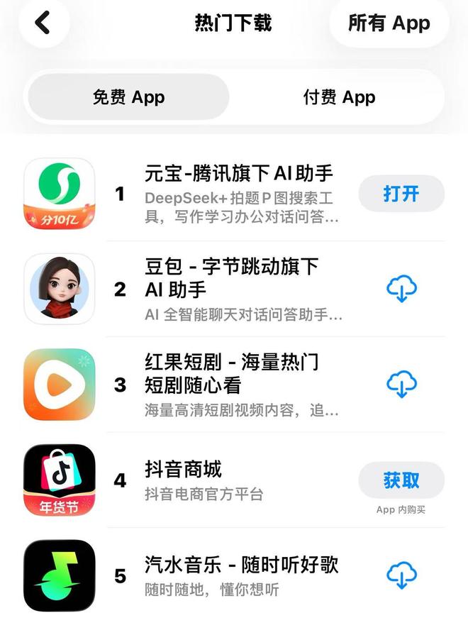 真金白银的投入也快速获得成效。蓝鲸新闻记者查询发现,2月1日中午腾讯元宝已经超越字节跳动的豆包升至苹果应用商店免费榜榜首。第二到第五名分别是字节跳动旗下的豆包、红果短剧、抖音商城和汽水音乐。