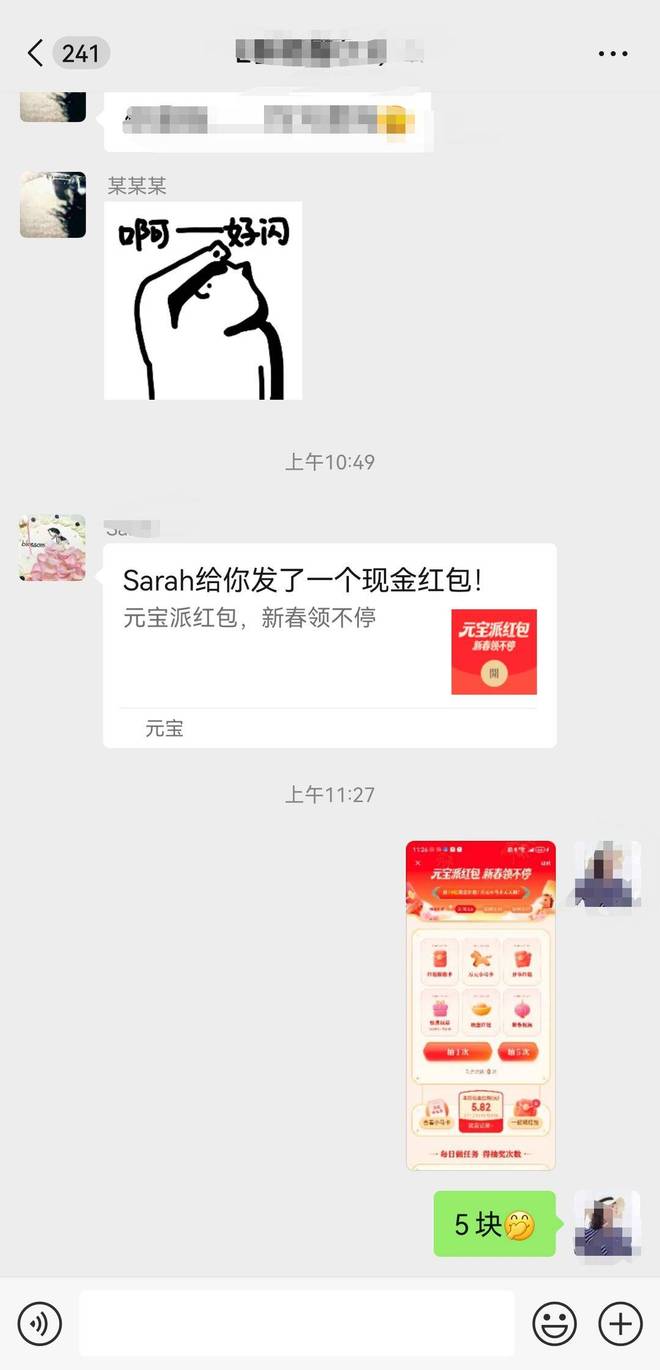 这时,发红包的好友主动出来“科普”:“是腾讯在推广元宝,听说2天后就能提现!”紧接着,另一位同学也跟风发了同款红包,群里大家你点我抽,玩得不亦乐乎。