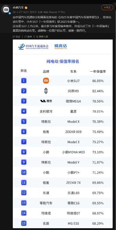 雷军对此拿出了中国汽车流通协会和精真估联合发布的“2025年度中国汽车保值报告”,并解释道:“小米 SU7的2025年度纯电车型一年保值率是86.05%,(保值率)排名第一位,是保值率最强的电动汽车。所以我也不太理解那么多二手车商突然冒出来,欢迎大家在看到时帮我们举报一下。并且现在网上也有很多记者实地去二手车行采访,小米 SU7在各家的流动速度、保值率方面都表现很出色。而且在过去几年里,小米 SU7在各家的保值率都排在第一位,例如保时捷 Taycan 当时是80.66%,特斯拉 Model S 是81.72%,而小米 SU7是以86% 的保值率获得了第一名。”