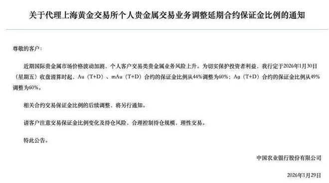 1月29日,农业银行发布《关于代理上海黄金交易所个人贵金属交易业务调整延期合约保证金比例的通知》,于1月30日收盘清算时起,Au(T+D)、mAu(T+D)合约的保证金比例从44%调整为60%。同时,农行请客户注意交易保证金比例变化及持仓风险,合理控制持仓规模,理性交易。