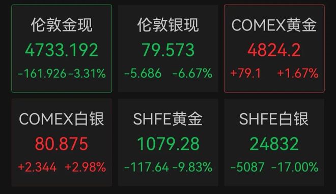 周一开盘,金银价继续大跌。截至发稿,现货黄金日内跌3.31%,报4733.192美元/盎司。现货白银日内跌6.67%,报79.573美元/盎司。