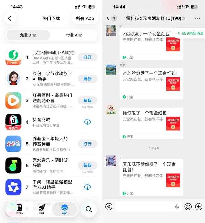不过,其他大厂也没闲着。还记得前两天上线的腾讯元宝分 10 亿春节红包不?整得那叫一个全网轰动啊。小雷每天两眼一睁,看到的不是微信好友发来的消息,而是群友那一条又一条的“xxx给你发了一个现金红包”。就这架势,堪比当年拼多多的砍一刀了。但不得不承认的是,这波流量赚到了,元宝 APP 的下载量也暴增。