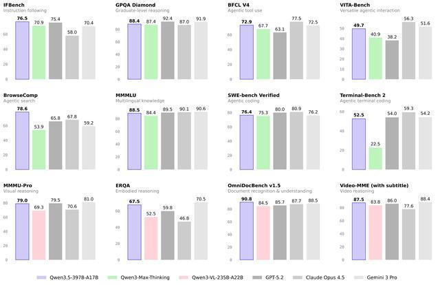 与前几代的千问大语言模型不同,千问3.5实现了从纯文本模型到原生多模态模型的代际跃迁。千问3预训练在纯文本Tokens上进行,而千问3.5则基于视觉和文本混合token上预训练,并大幅新增中英文、多语言、STEM和推理等数据,让张开“眼睛”的大模型学会了更密集的世界知识和推理逻辑,以不到40%的参数量获得超万亿的Qwen3-Max基座模型的顶尖性能,在推理、编程、Agent智能体等全方位基准评估中均表现优异。