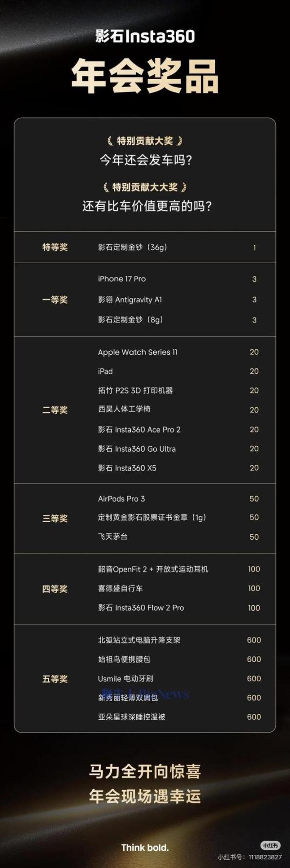 网上流传的影石Insta360年会奖品清单还显示,特等奖为36克影石定制金钞,一等奖则包含3台iPhone17Pro、3台影翎AntigravityA1以及3份8克定制金钞,各类奖品总数超3600份。影石方面也向极目新闻记者证实,该奖品清单属实,中奖率高达80%。其中,特等奖36g金纸(含黄金36g),被一位入职10天的新同事收入囊中,实习生现场抽走一台iPhone17Pro。