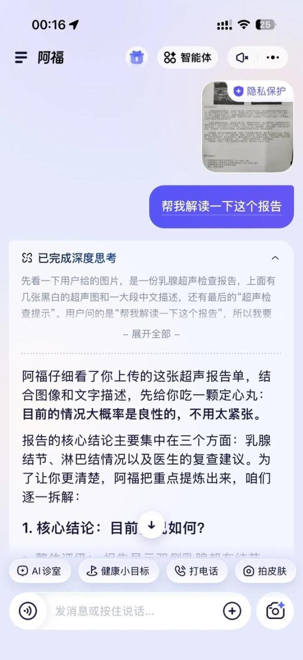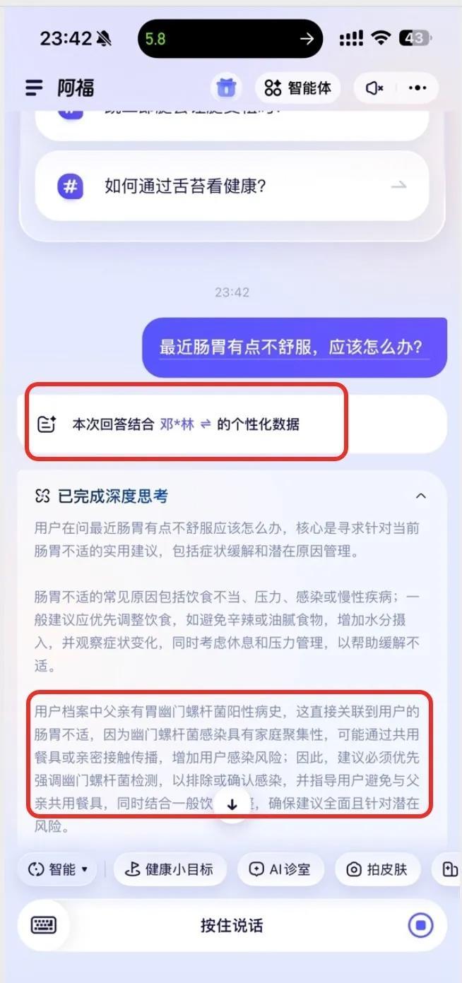 但比起这些热度,更值得关注的是它的产品定位——与偏娱乐化、工具化的其他AI不同,阿福聚焦的是“健康”这个垂直场景。