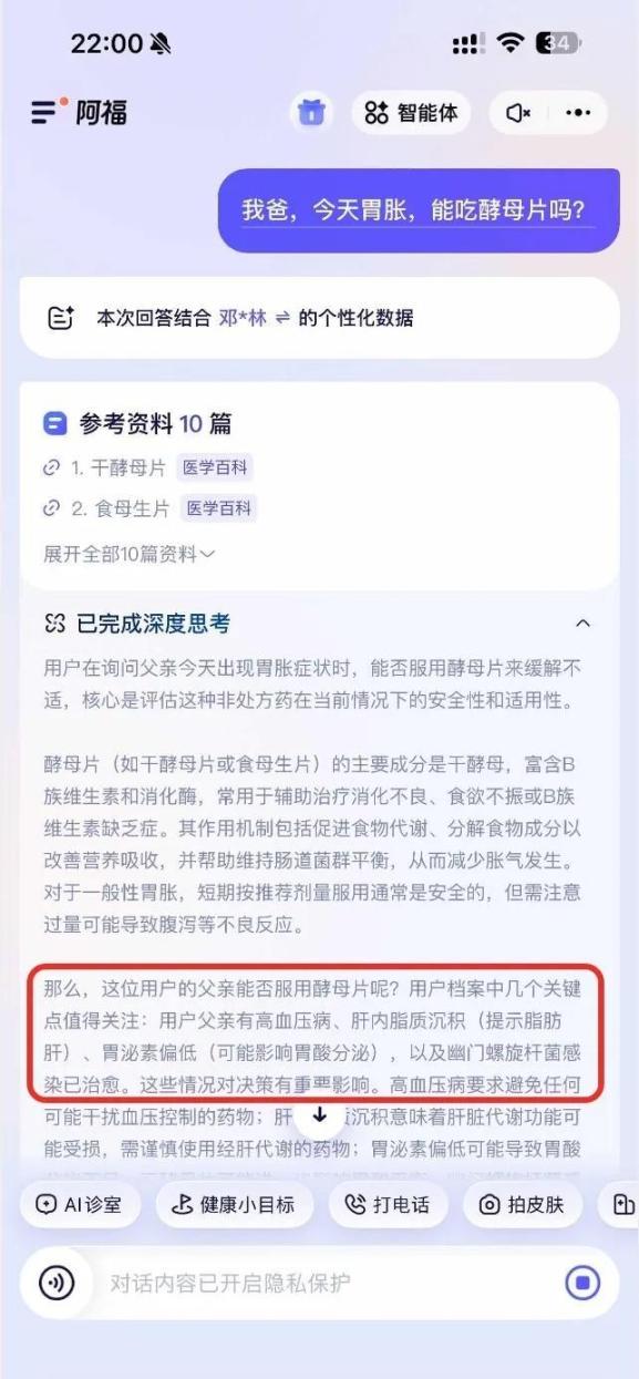 把过往的病历、体检报告、用药记录上传建档后,后续提问会自动带上这些背景信息。比如问“我爸这两天胃胀,能吃这个药吗”,系统会结合之前上传的病史和用药情况来综合判断。