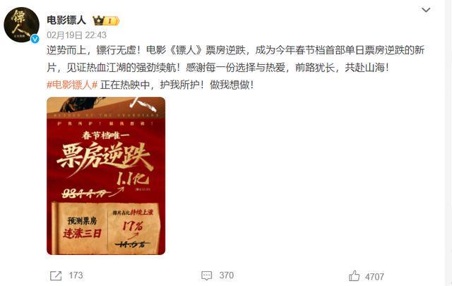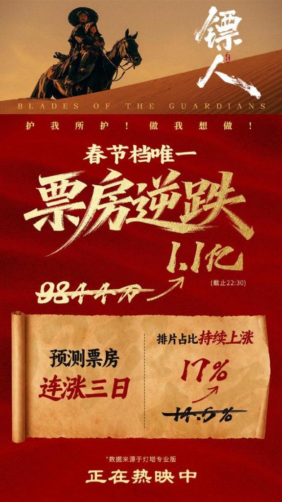 2月19日晚,电影镖人官方微博发文称预测票房连涨三日:“逆势而上,镖行无虚!电影《镖人》票房逆跌,成为今年春节档首部单日票房逆跌的新片,见证热血江湖的强劲续航!感谢每一份选择与热爱,前路犹长,共赴山海!”
