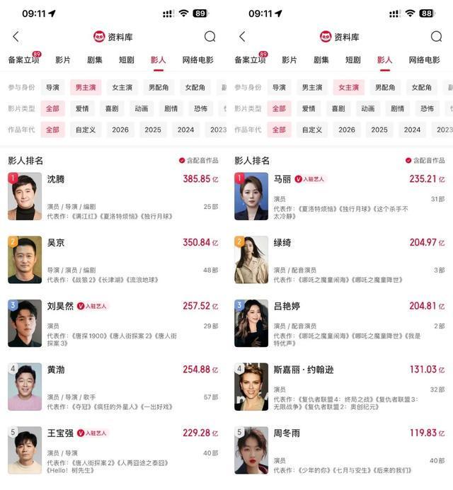 女主演方面,马丽以235.15亿元领跑,她与沈腾多次合作的喜剧作品贡献了主要票房。绿绮凭借《哪吒之魔童闹海》等动画配音作品,以205.35亿元位居第二;吕艳婷同样因《哪吒之魔童闹海》的配音,以204.81亿元位列第三。