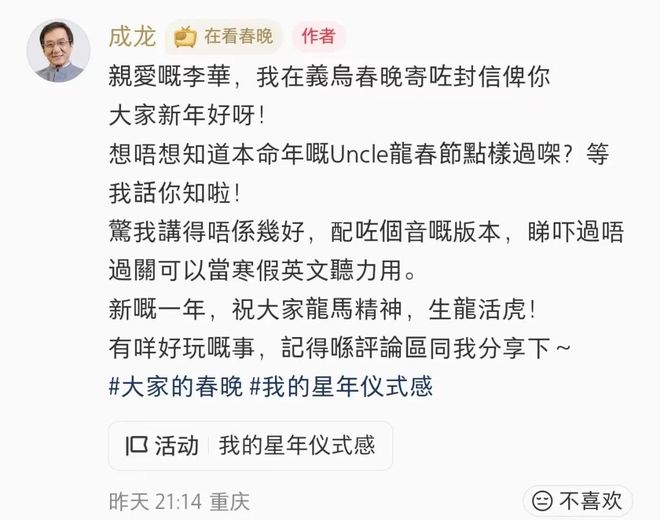 成龙发的微博截图