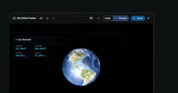谷歌给出的示例中,用户给出文字指令,Gemini 3.1 Pro生成了构建一个高保真、可交互的3D国际空间站(ISS)轨道追踪器。使用高分辨率的Blue Marble纹理贴图渲染一个精细的3D地球模型。