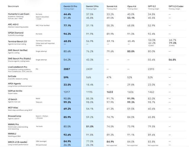谷歌Gemini 3.1 Pro这次在ARC抽象推理和BrowseComp搜索任务上显著拉开差距,显示出明显的Agent倾向,而非单纯知识模型。