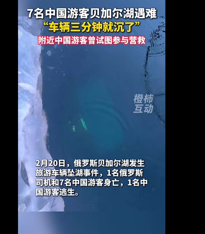据新华社报道,中国驻伊尔库茨克总领馆2月20日证实,北京时间下午3时30分左右,一辆载有8名中国游客的车辆当天在俄罗斯贝加尔湖奥利洪岛附近因冰面破裂沉湖,其中1名中国游客逃生,其余7名中国游客溺亡,涉事车辆上还有1名俄罗斯司机。