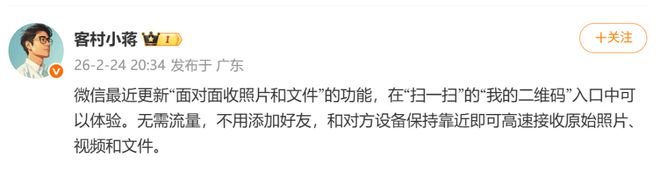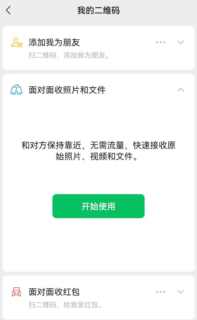 近日,微信员工“客村小蒋”发布微博称,微信最近更新了“面对面收照片和文件”的功能,在“扫一扫”的“我的二维码”入口中可以体验。无需流量,不用添加好友,和对方设备保持靠近即可高速接收原始照片、视频和文件。