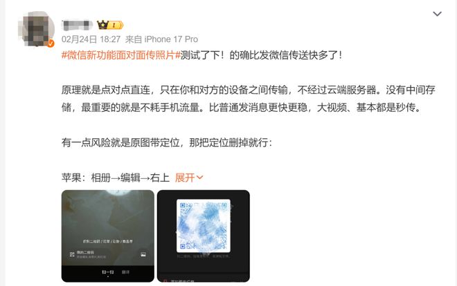 近期,多名博主分享对该功能的测试心得,均对传输速度表示肯定,认为适合面对面分享大文件。该功能解决了苹果端和安卓端的视频传输需要,对自媒体运营、授课收集作业、摄影圈分享等场景非常友好。